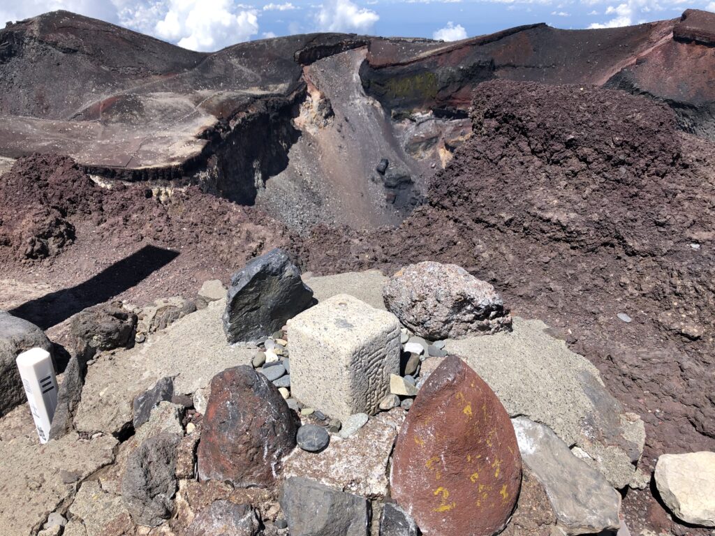 いえいえそうじゃないんです。この標高はあくまでも三角点が設置されている場所の標高です。じゃあ、じゃあ、日本最高地点はどこなんだよ!と思いますよね。正解の場所は三角点の奥(北側)の岩石なんです。そこには三角点を作れなかったので、その近くの地盤がしっかりした今の場所に設置となりました。国土地理院の発表によりますと、その最高地点の標高が3776.24m(平成3年測量)だそうです。つまり三角点の場所、剣が峰の石柱の場所が日本最高地点ではありません。その奥の岩石の頂が正真正銘の日本最高地点です。