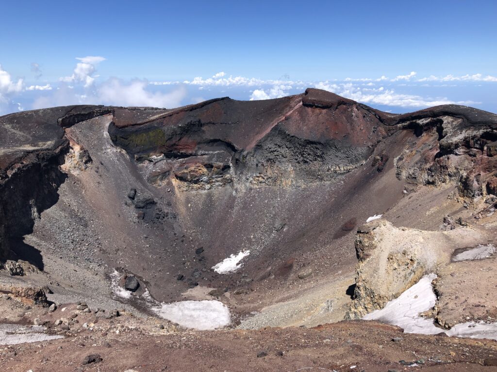 では、何も考えずに!富士山山頂火口(大内院)の様子です。1枚の写真におさまりきらない程の大迫力です。この火口の最深部は200mほどあり富士山の8合目あたりに相当します。