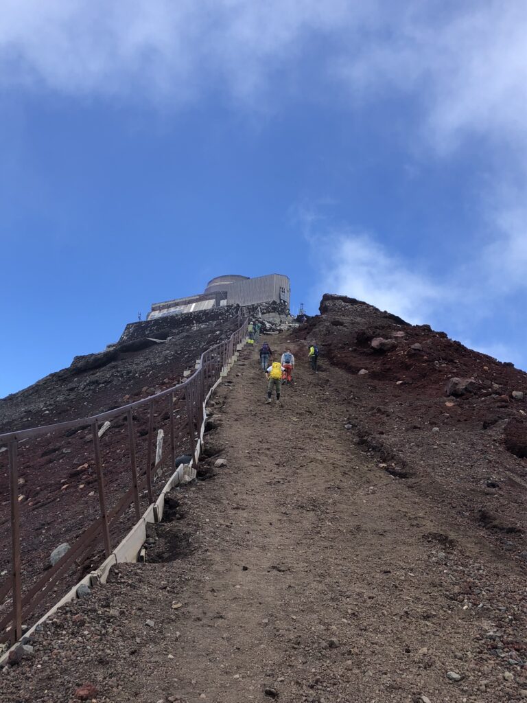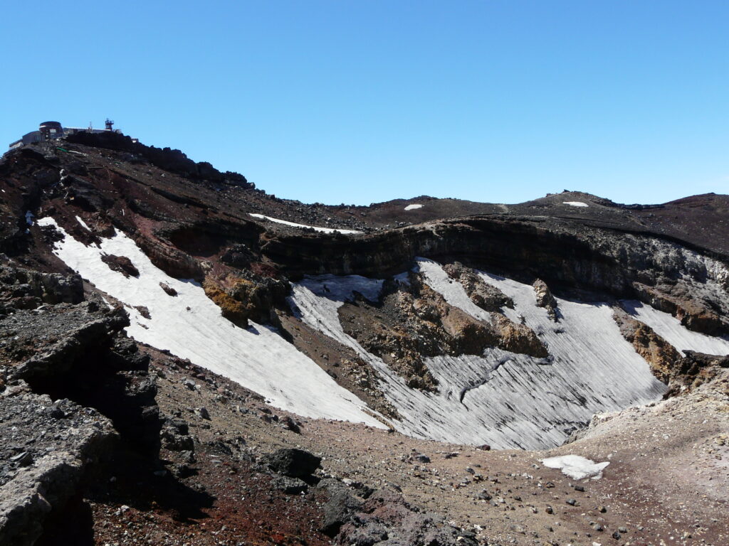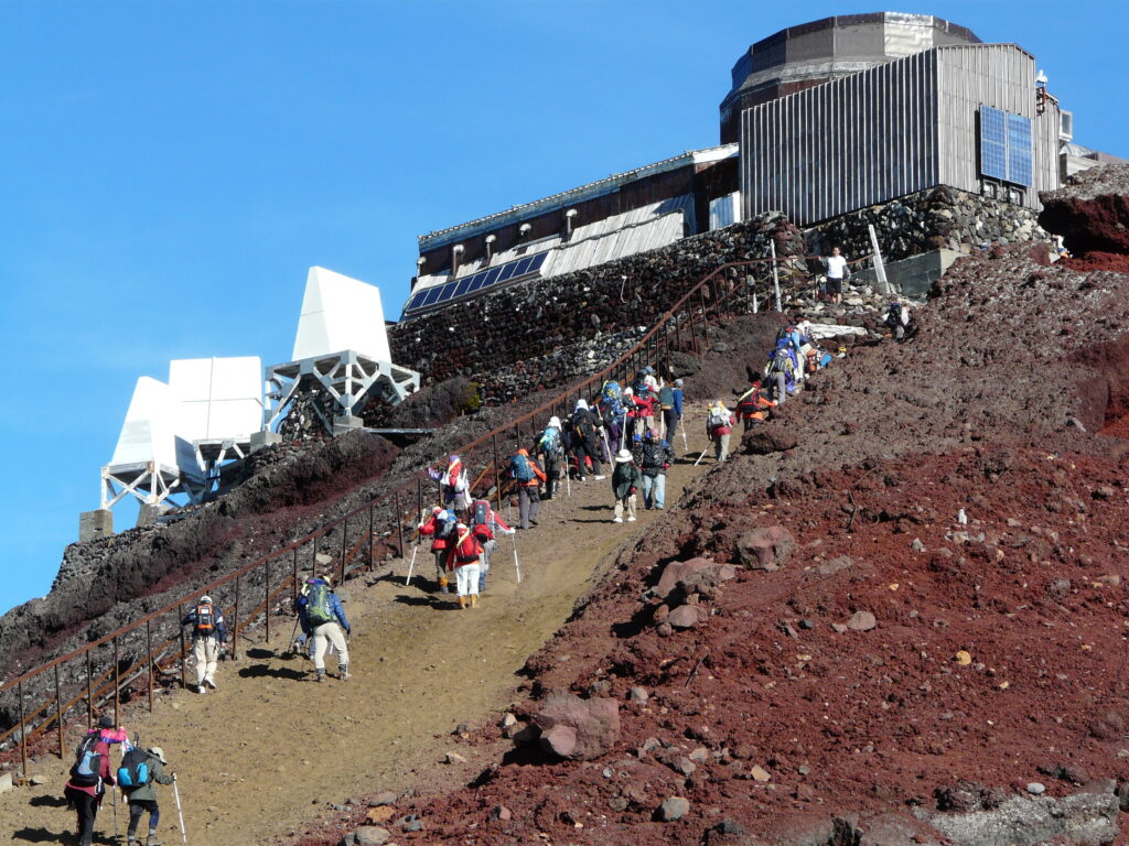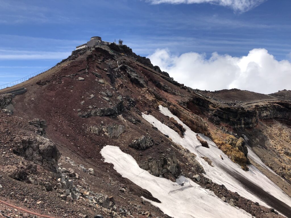 左上にあるのが旧富士山測侯所で、それがある頂きが剣が峰です。現在はその役目を終えて麓の富士吉田の富士山レーダードーム館に移築されています。2004年まで有人観測がされていました。気象衛星時代の前は台風の予測等に大変役にたった貴重な施設です。