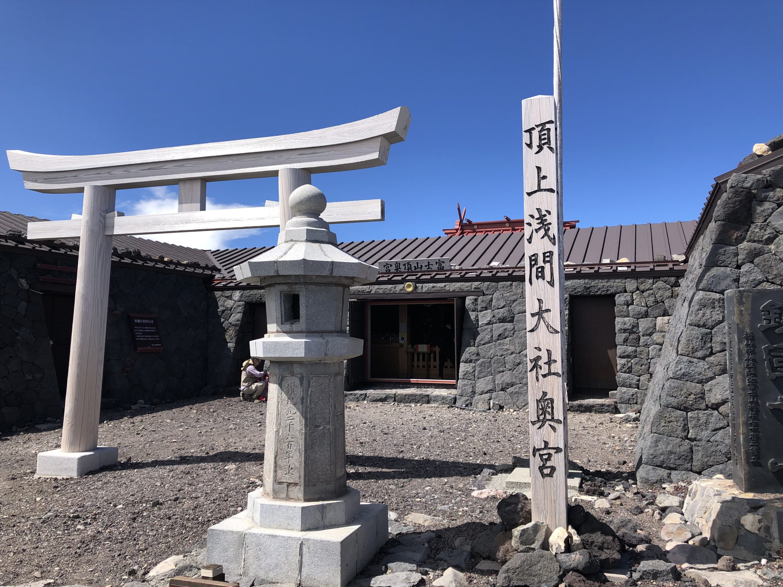 富士浅間神社の奥宮と富士山頂郵便局、山頂の山小屋、頂上富士館があり登山客もゆっくり休憩をとる姿が多く見えます。